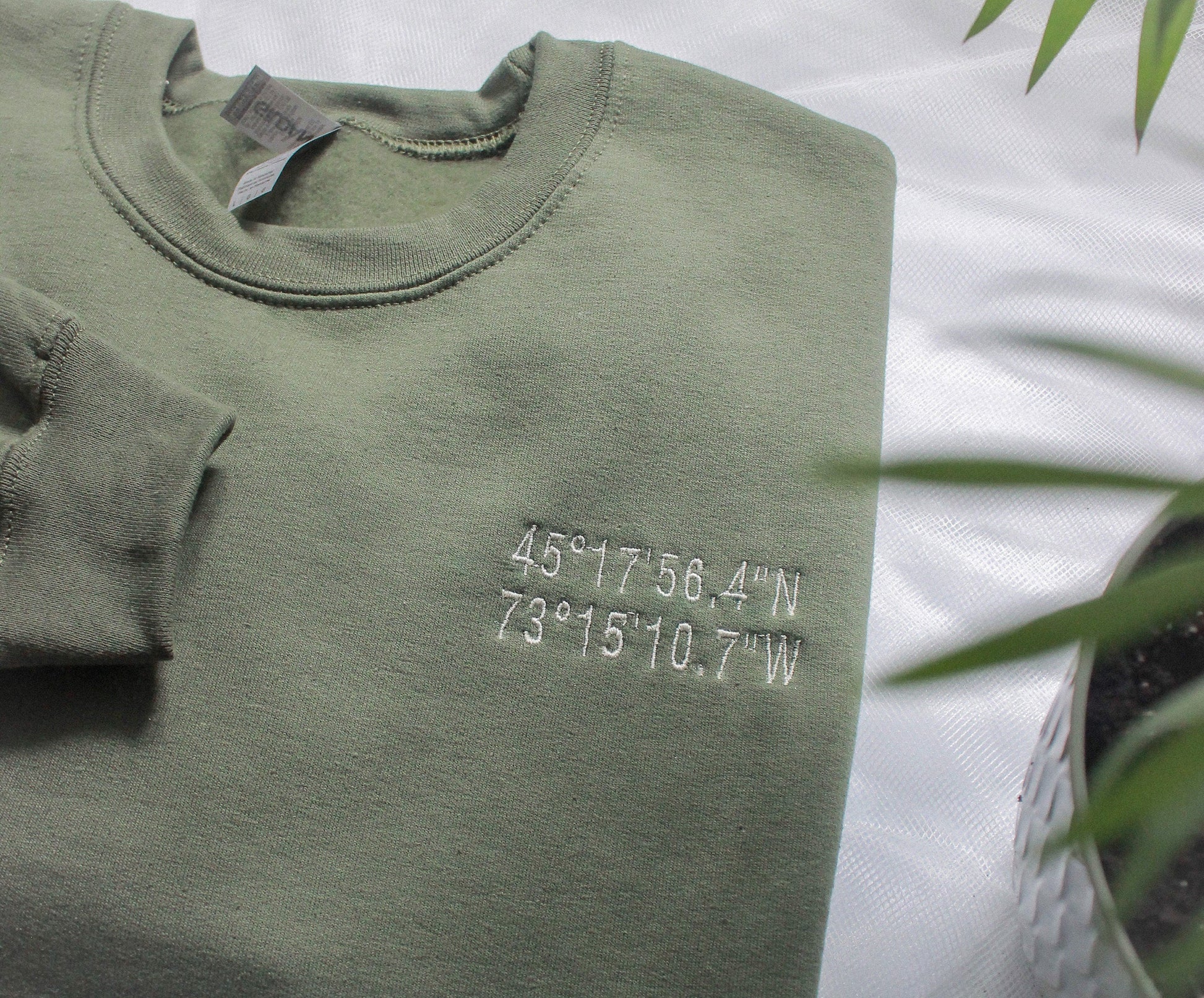 Celebrate a special place with a cozy embroidered sweatshirt featuring your custom GPS coordinates. Stitched with real thread, not vinyl.
